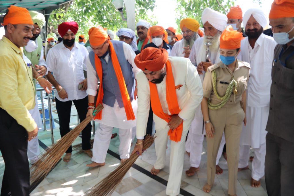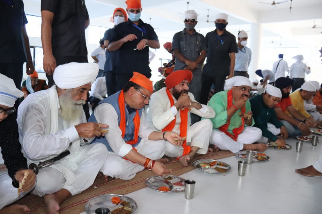 रूद्रपुर- प्रदेश के राज्यपाल ले0ज0(सेनि0) गुरमीत सिंह एवं प्रदेश के मुख्यमंत्री पुष्कर सिंह धामी ने एक दिवसीय कार्यक्रम के दौरान गुरूद्वारा नानकमत्ता साहिब में पहुचकर मत्था टेक कर प्रदेश की खुशहाली के लिए अरदास की इसके उपरान्त उन्होने गुरूद्वारा परिसर में झाड़ू लगाई तदोपरान्त लंगर में बैठकर प्रसाद ग्रहण किया।
