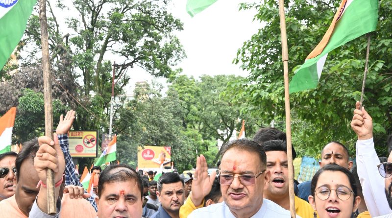 मसूरी विधानसभा में आयोजित हर घर तिरंगा कार्यक्रम के तहत तिरंगा यात्रा में सम्मिलित हुए भाजपा प्रदेश अध्यक्ष महेन्द्र भट्ट एवं कैबिनेट मंत्री गणेश जोशी, तिरंगा हमारे आन बान और सम्मान का प्रतीक, भारत को एक सूत्र में बांधने का काम करता है तिरंगा – गणेश जोशी
