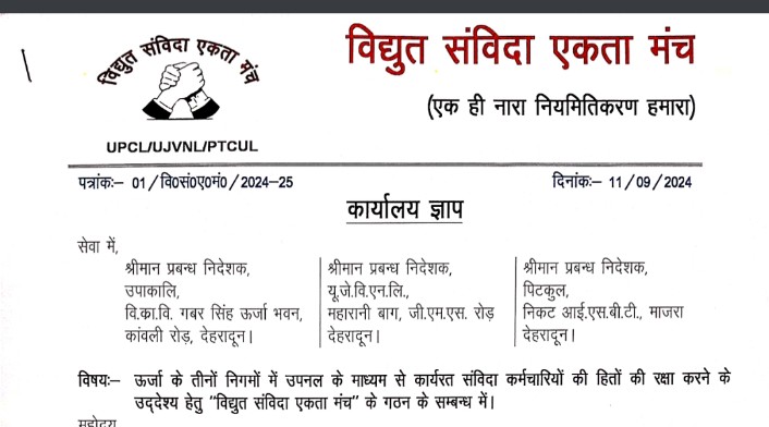 ऊर्जा के तीनों निगम प्रबंधनों व उत्तराखंड सरकार की लगातार अनदेखी के चलते ऊर्जा निगमों में संविदा कर्मचारियों से जुड़े संगठनों द्वारा मिलकर लड़ने का निर्णय लिया है। जिसके लिए “विद्युत संविदा एकता मंच” का गठन किया गया।