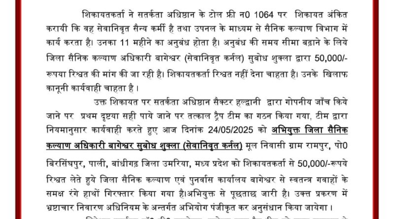 उत्तराखण्ड में मुख्यमंत्री पुष्कर सिंह धामी के नेतृत्व में भ्रष्टाचार के खिलाफ लगातार सख्त कदम उठाए जा रहे हैं। इसी क्रम में एक और बड़ी कार्रवाई करते हुए हल्द्वानी स्थित सतर्कता अधिष्ठान (विजिलेंस) की टीम ने जनपद बागेश्वर के जिला सैनिक कल्याण अधिकारी सूबोध शुक्ला (सेवानिवृत्त कर्नल) को ₹50,000 की रिश्वत लेते हुए रंगे हाथ गिरफ्तार किया है।