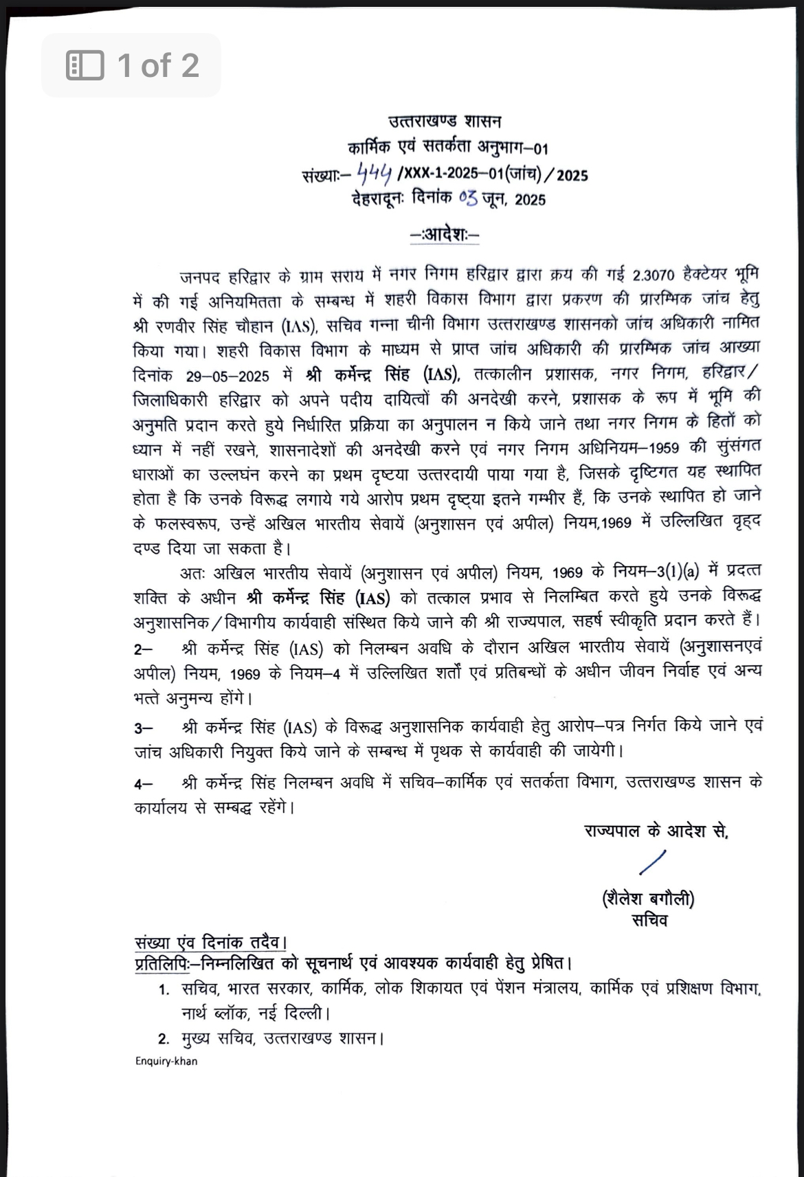इन तीनों अधिकारियों को वर्तमान पद से हटाया गया है और शासन स्तर पर आगे की विभागीय और दंडात्मक कार्यवाही प्रारंभ कर दी गई है। यह केवल प्रशासनिक निर्णय नहीं, बल्कि भ्रष्टाचार के खिलाफ मुख्यमंत्री की शून्य सहनशीलता की नीति का स्पष्ट प्रमाण है। इसके साथ ही निकिता बिष्ट (वरिष्ठ वित्त अधिकारी, नगर निगम हरिद्वार), विक्की (वरिष्ठ वैयक्तिक सहायक), राजेश कुमार (रजिस्ट्रार कानूनगों), कमलदास (मुख्य प्रशासनिक अधिकारी, तहसील हरिद्वार को भी जमीन घोटाले में संदिग्ध पाए जाने पर तुरंत प्रभाव से निलंबित किया है।